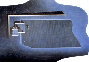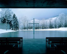 «La aproximación al conjunto se realiza siguiendo la trayectoria del muro exento y ascendiendo por una suave ladera hasta llegar a la zona de acceso, definida en sus cuatro lados por un vidrio mate blanco. Este recinto de luz, en el que se alzan cuatro cruces contiguas, se mezclan la luz solar -intensa y directa – y la luz filtrada a través del vidrio mate, envolviendo a los visitantes en un sutil contraste que da solemnidad al lugar. Del recinto parte una escalera, oscura y curvada, que conduce a la repentina visión de una quinta cruz y del lago azul oscuro. El horizonte separa el cielo de la tierra, lo sagrado de lo profano. El paisaje va cambiando gradualmente de apariencia, en una transición en la que los visitantes pueden sentir la presencia de la naturaleza y de lo sagrado. La luz del sol, el lago y el cielo continuarán entonando distintas melodías.»