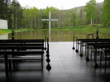 Esta representación es siempre cambiante, variando según las estaciones del año: de los tonos ocres del otoño, los blancos del invierno a los verdes de la primavera. Coloca en el exterior, en medio del estanque una gran cruz metálica, visible desde la capilla como punto central de la naturaleza.