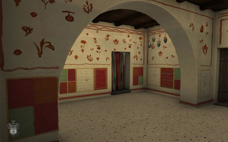 «Mediante un nuevo atrio, construido en la parte oriental de la sala y pavimentado con cal blanca, los fieles podían acceder al lugar venerado, repavimentado con yeso policromado y dividido en dos por una gran arcada mediana que sostenía el nuevo techo de terraza. Una renovada decoración pictórica recubrió las paredes de la sala: sobre un fondo homogéneo blanco-crema se pintaron sujetos no ilustrados como paneles geométricos, bandas de color y racimos de fruta y flores.
