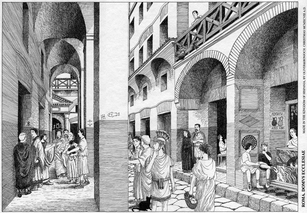 «En el dibujo se ve cómo los cristianos se encuentran bajo el pórtico de un bloque de viviendas, a la puerta de su local, en una calle típica de la Roma imperial. En los pilares de este pórtico hay dibujos que muestran los primeros símbolos cristianos: el pez, el crismón, el ancla y el anagrama de Jesús, para identificar la proximidad de una domus ecclesiae». (J. Oliver-Bonjoch)
