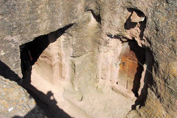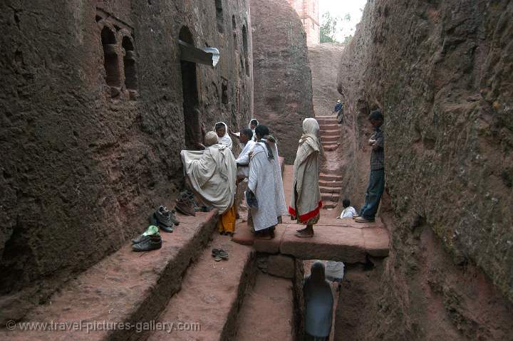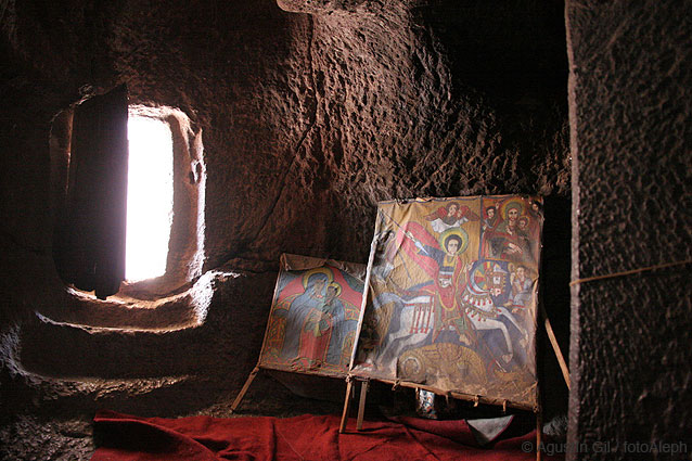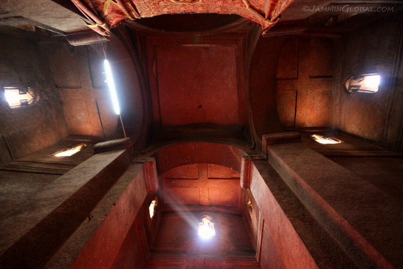 El interior del templo está dominado por una oscuridad casi absoluta, pues sólo entra levemente la luz por unas diminutas ventanas perforadas en los muros. Éstas tienen diversos diseños y están colocadas a diferentes niveles. Las de la parte superior están coronadas con un arco de estilo axumita y representan el Antiguo Testamento, mientras que las del nivel inferior muestran varios tipos de cruces labradas en celosía y representarían al Nuevo Testamento, con el omnipresente símbolo de la cruz.