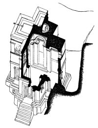 El suelo del templo se encuentra por debajo del nivel del suelo del patio, pues ha sido cincelado toscamente de la roca.