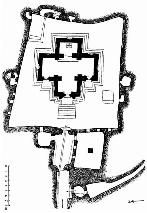 En la fachada oeste son visibles unos nichos de forma rectangular y tragaluces cruciformes. Las columnas exteriores tienen un diámetro entre 80 y 100 cm.