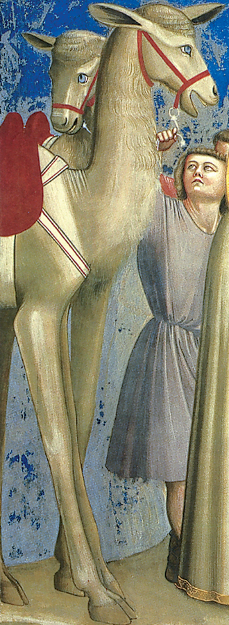 En la zona de La adoración de los Reyes Magos, en el cual observamos a los dos camellos sujetados por dos camelleros, lo que primero nos llama la atención es como han sido dibujados los camellos por Giotto. Les pinta unas orejas más propias de un asno, las patas similares a las de un caballo y para rematar les pinta con ojos azules. Todo esto prueba con toda seguridad que Giotto no había visto en toda su vida un camello de verdad. Respecto a los camelleros, uno aparece en segundo plano, interactuando con uno de sus camellos, y el otro se encuentra justo detrás de éste siendo casi inapreciable; probablemente Giotto se sirviera de ellos para dotar de mayor profundidad visual al fresco.