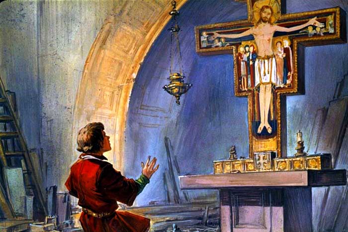 «El joven Francisco está pasando una grave crisis espiritual, lleno de dudas, incertidumbres y tinieblas. En ese estado de ánimo, «guiado por el Espíritu» entra en la iglesita de San Damián, se postra suplicante y devoto ante el Crucifijo, y, tocado de modo extraordinario por la gracia divina, se siente totalmente cambiado. La imagen de Cristo crucificado le habla desde el cuadro: «Francisco -le dice, llamándolo por su nombre-, vete, repara mi casa (domum meam), que, como ves, se viene del todo al suelo (destruitur)». Francisco queda estupefacto y casi pierde el sentido por las palabras que ha oído. Pero inmediatamente se dispone a obedecer y todo él se concentra en el mandato recibido (2 Cel 10).