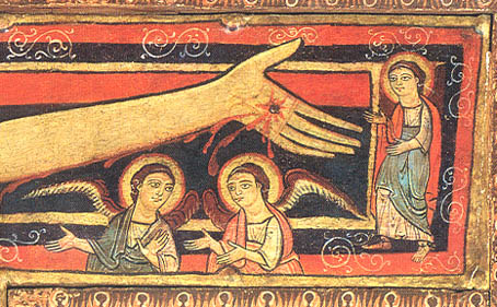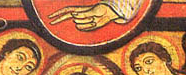 La cabeza de Cristo está fuera del círculo. Y eso que el círculo, en la iconografía, es símbolo de perfección, de plenitud. Pero la perfección y plenitud humanas no pueden abarcar a Cristo. Cristo rebasa toda plenitud. Por eso está su rostro por encima del círculo. A izquierda y a derecha, unos ángeles. Miran a Cristo que entra en la gloria.