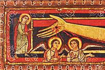 En el semicírculo, una mano con dos dedos extendidos. Es la mano del Padre que envía a su Hijo al mundo y, a la vez, lo recibe en la gloria.