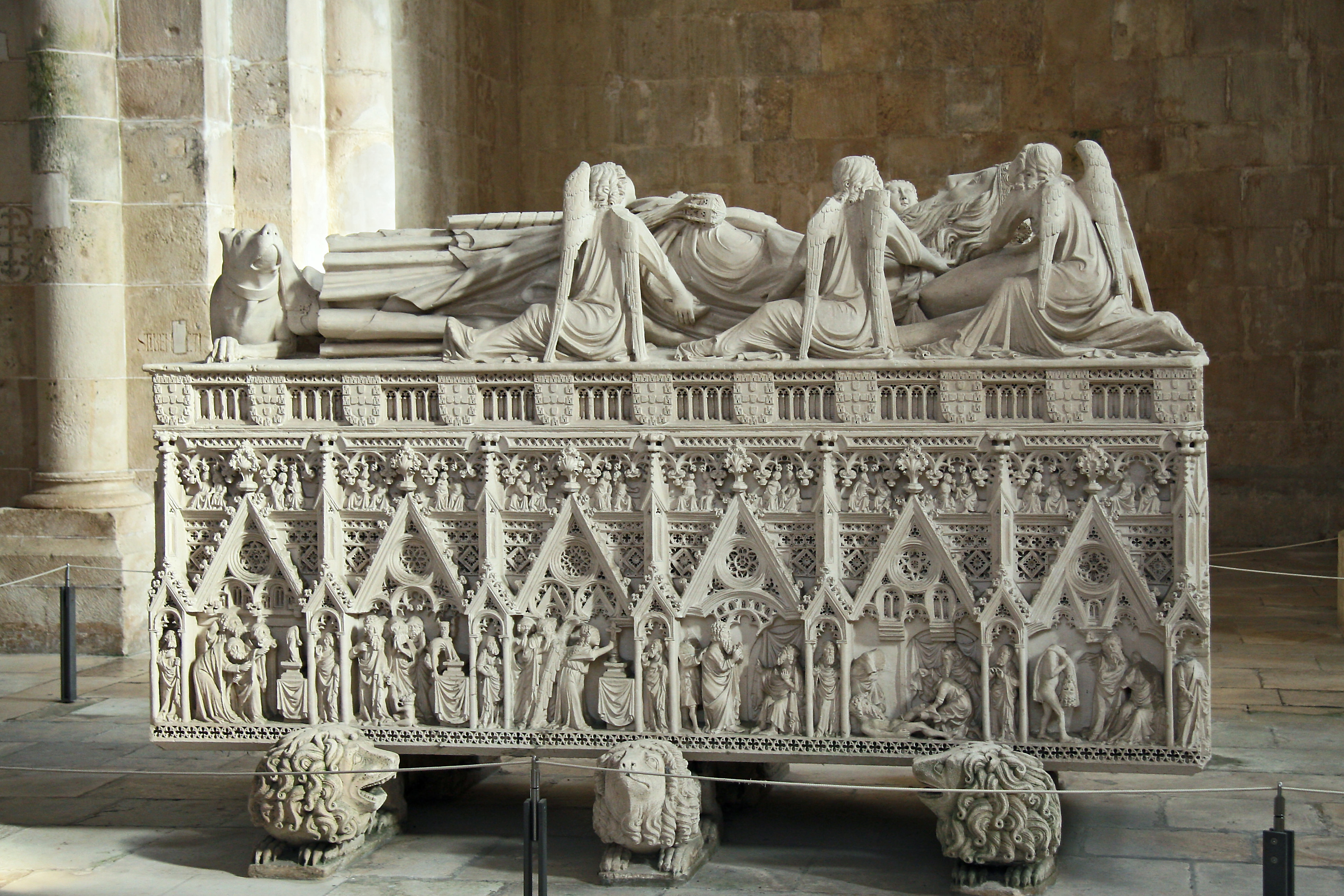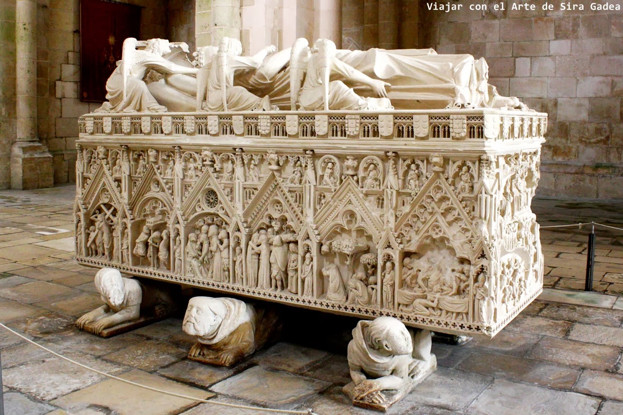 Los dos túmulos funerarios son un magnífico ejemplo del estilo funerario gótico portugués (escuela de Coímbra). El primero en construirse es el de doña Inés. Ella aparece vestida a la usanza de la época, su cabeza apoyada en un almohadón que finaliza en un baldaquino. A su alrededor unos ángeles la custodian y a sus pies un pequeño perro le hace compañía. En los frisos se mezclan el escudo de armas de la familia Castro con los de la familia real portuguesa y escenas del Nuevo Testamento; en la cabecera un Calvario y, en el lado opuesto, el Juicio Final.
