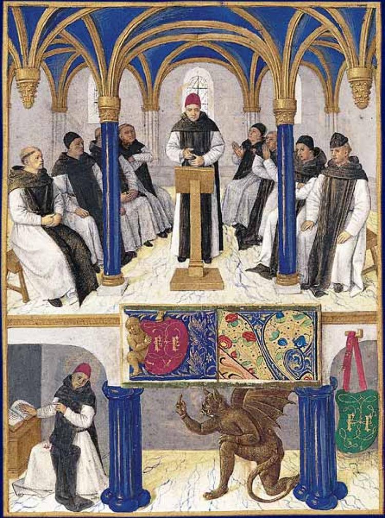Bernardo de Claraval enseñando en la sala capitular, Heures d’Étienne Chevalier, ilustradas por Jean Fouquet, museo Condé, Chantilly