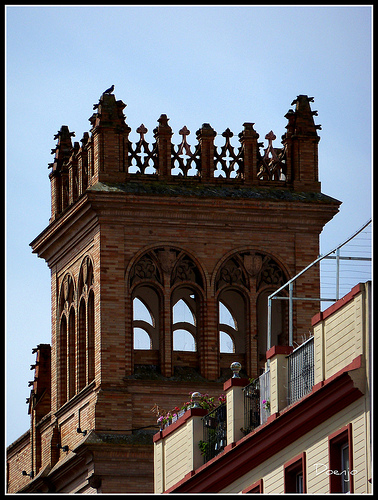 La fachada concluye en su parte más alta en una serie de pináculos. En un extremo del inmueble diseña una original torre-mirador de planta cuadrada, abierta por sus cuatro lados, y rematada por una alta crestería (adorno muy utilizado en la época medieval con forma de crestas de gallo caladas).