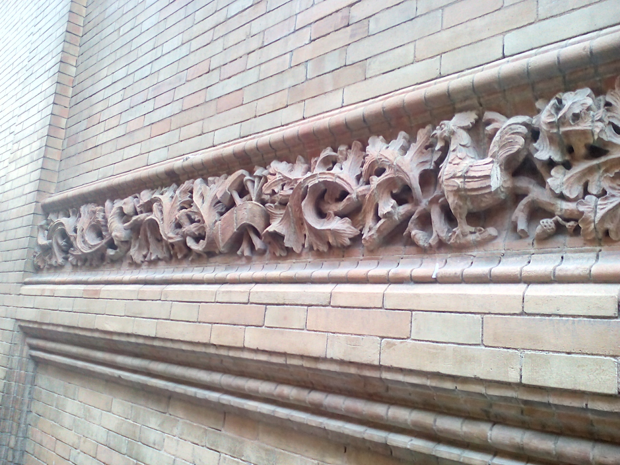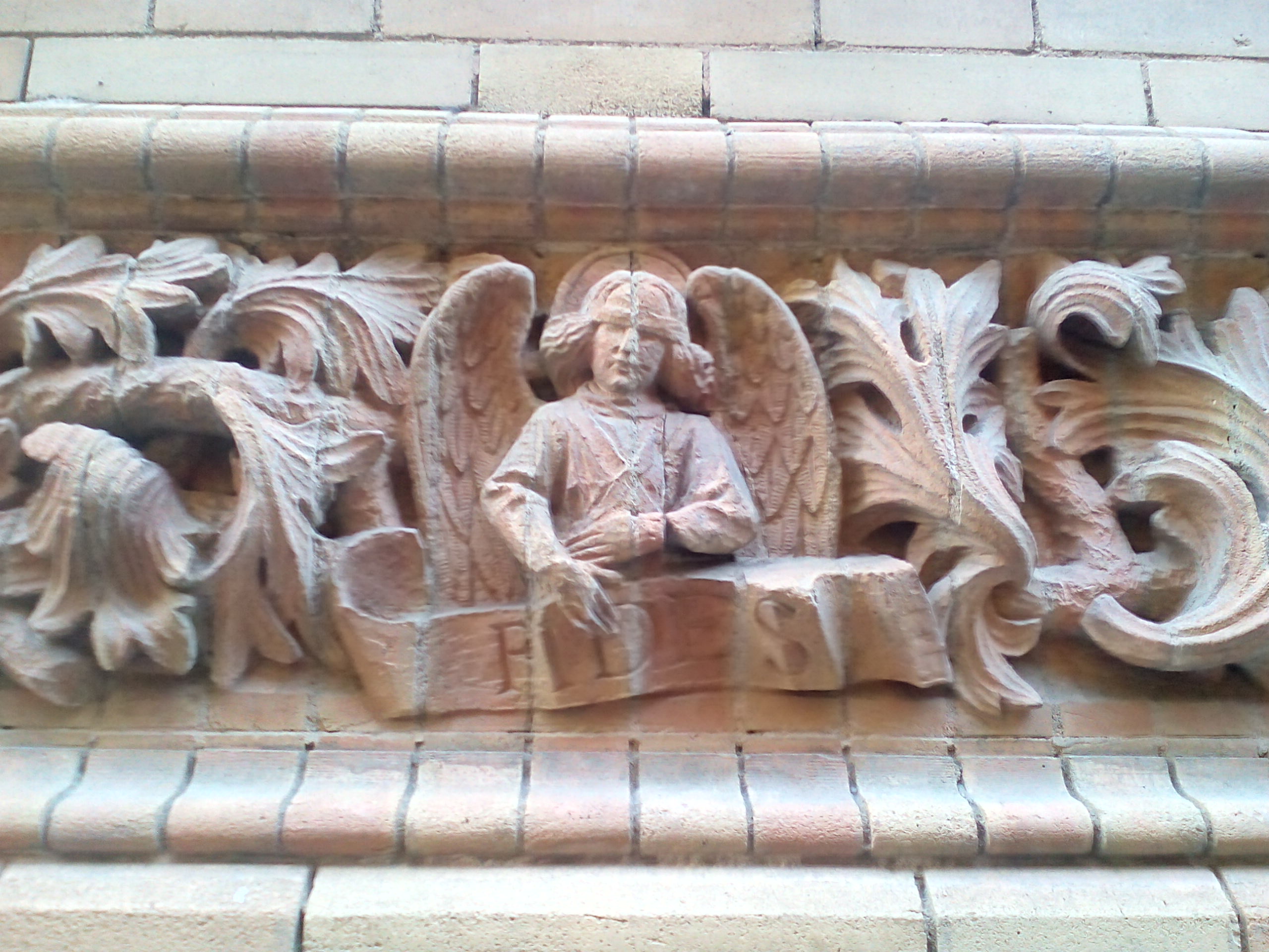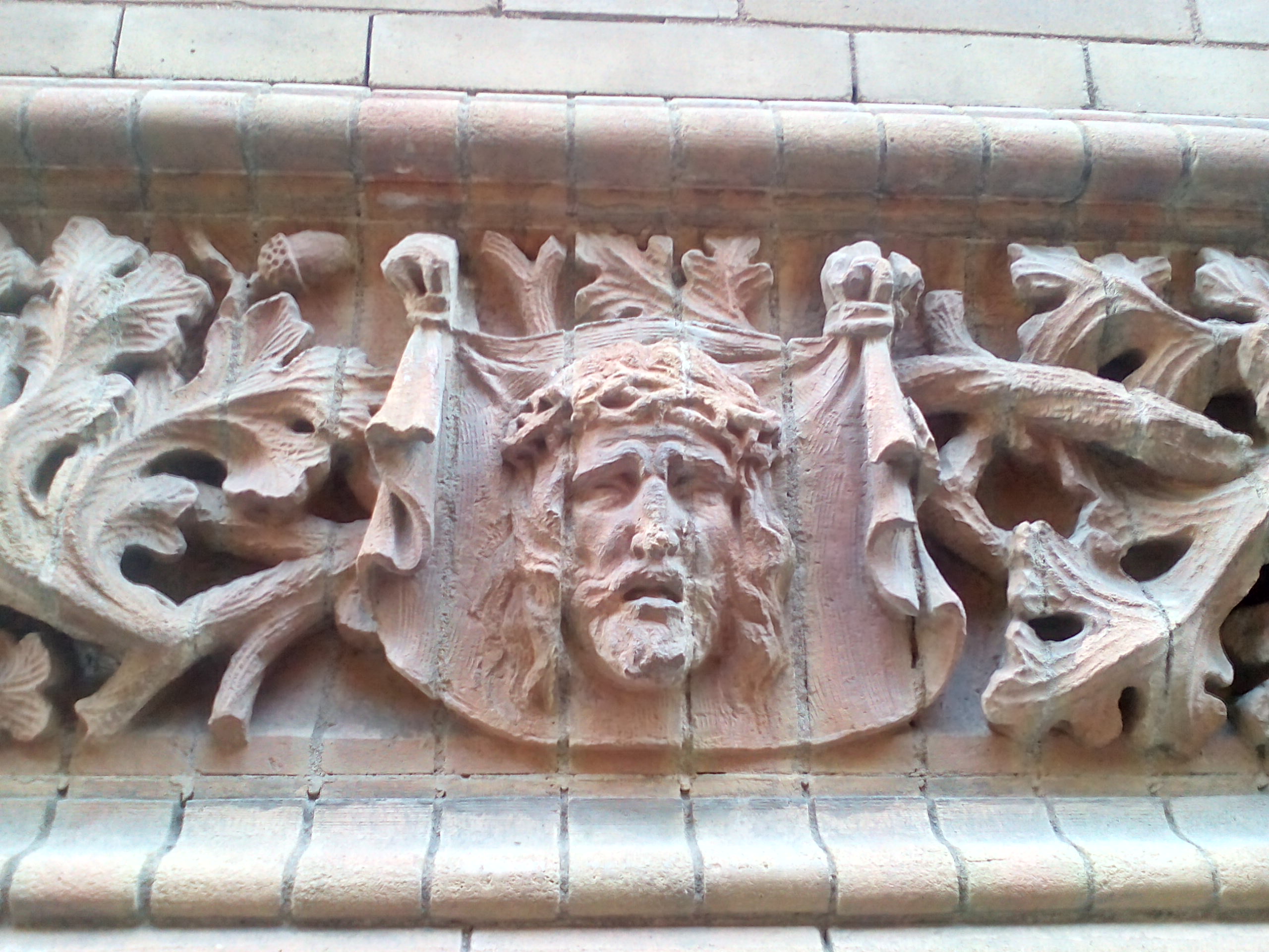 A lo largo de toda la fachada el ladrillo aparece maravillosamente labrado en las alargadas cenefas compuestas por diminutas figuras de simbología cristiana entre temas vegetales.