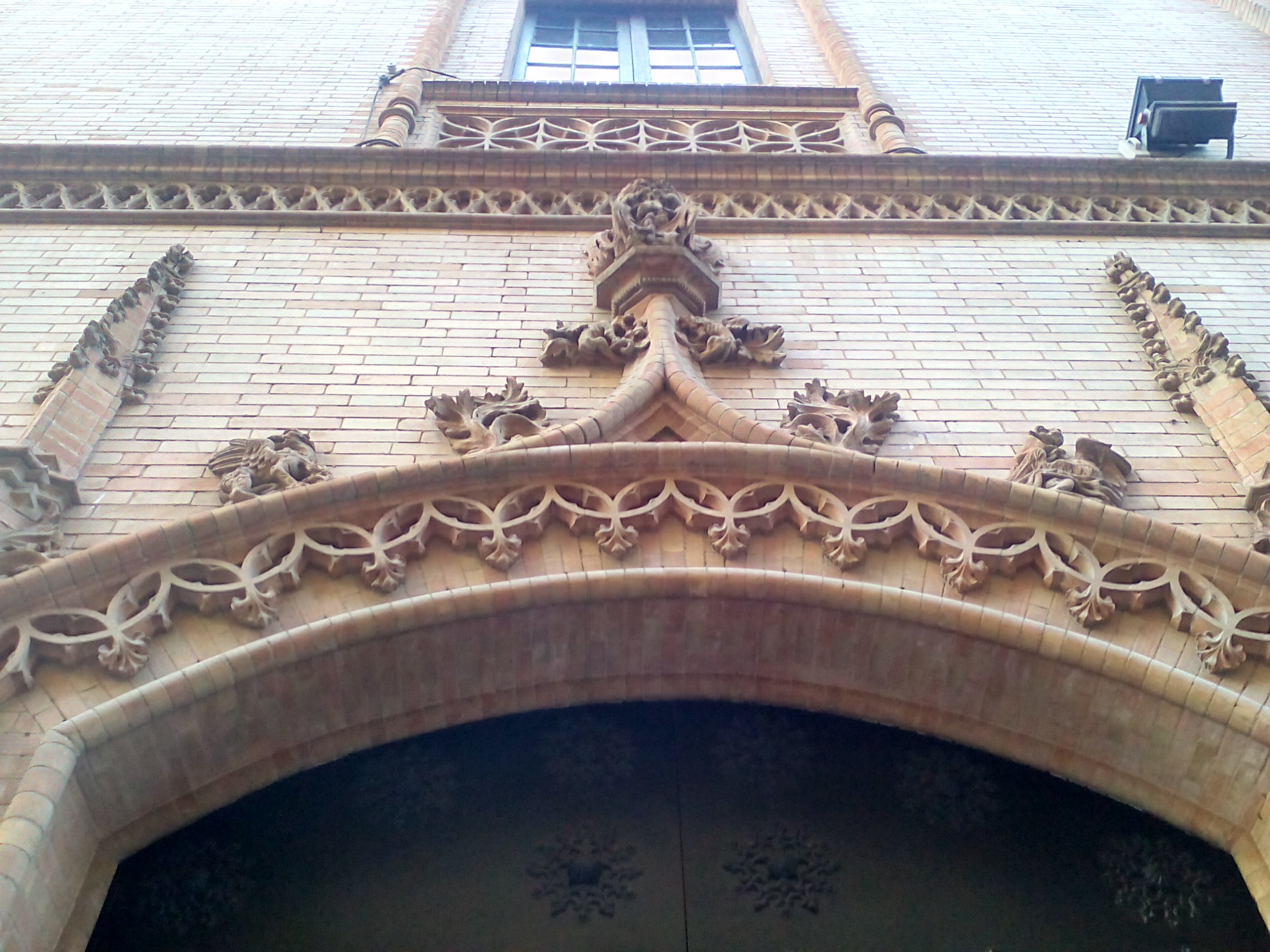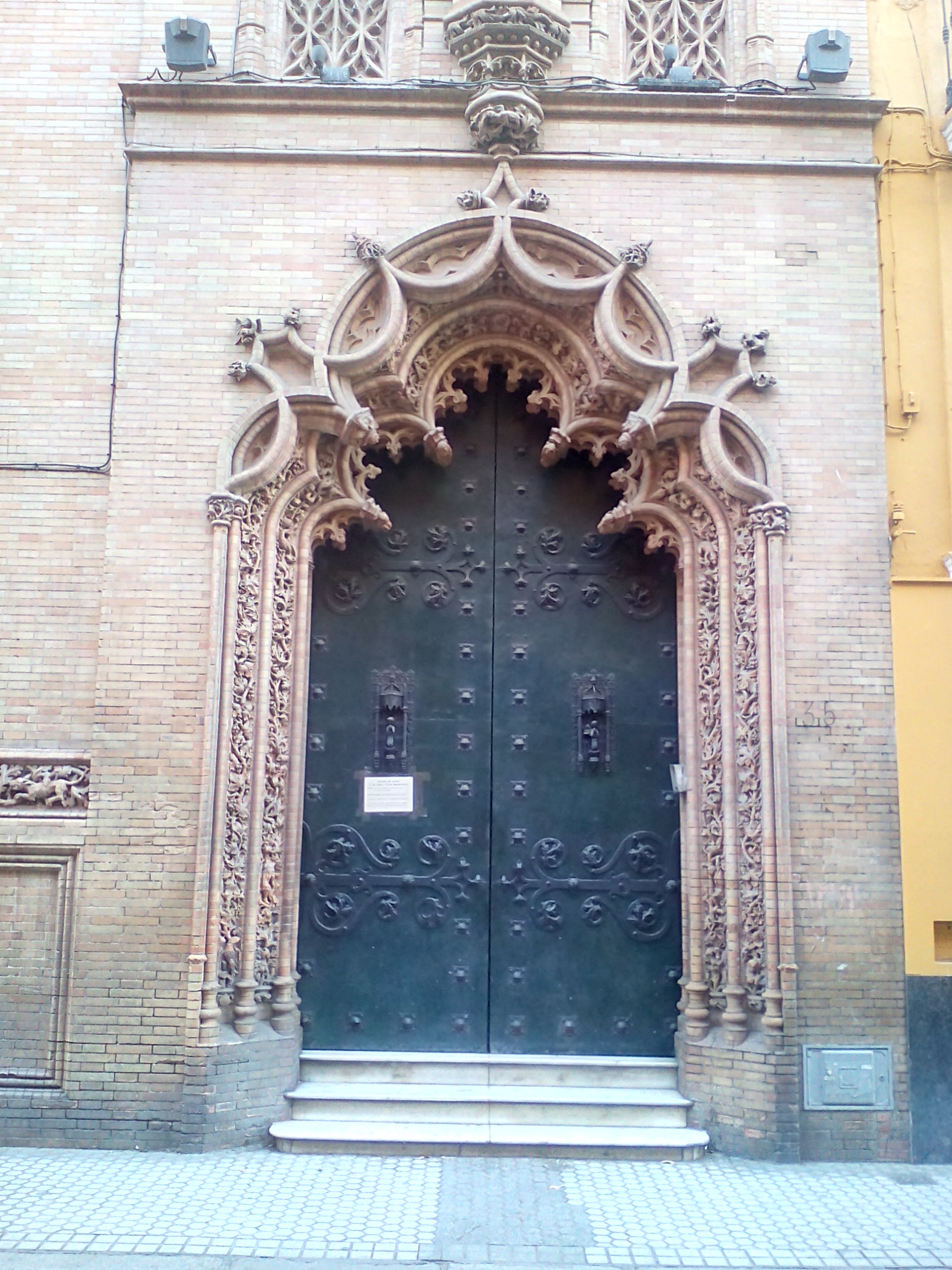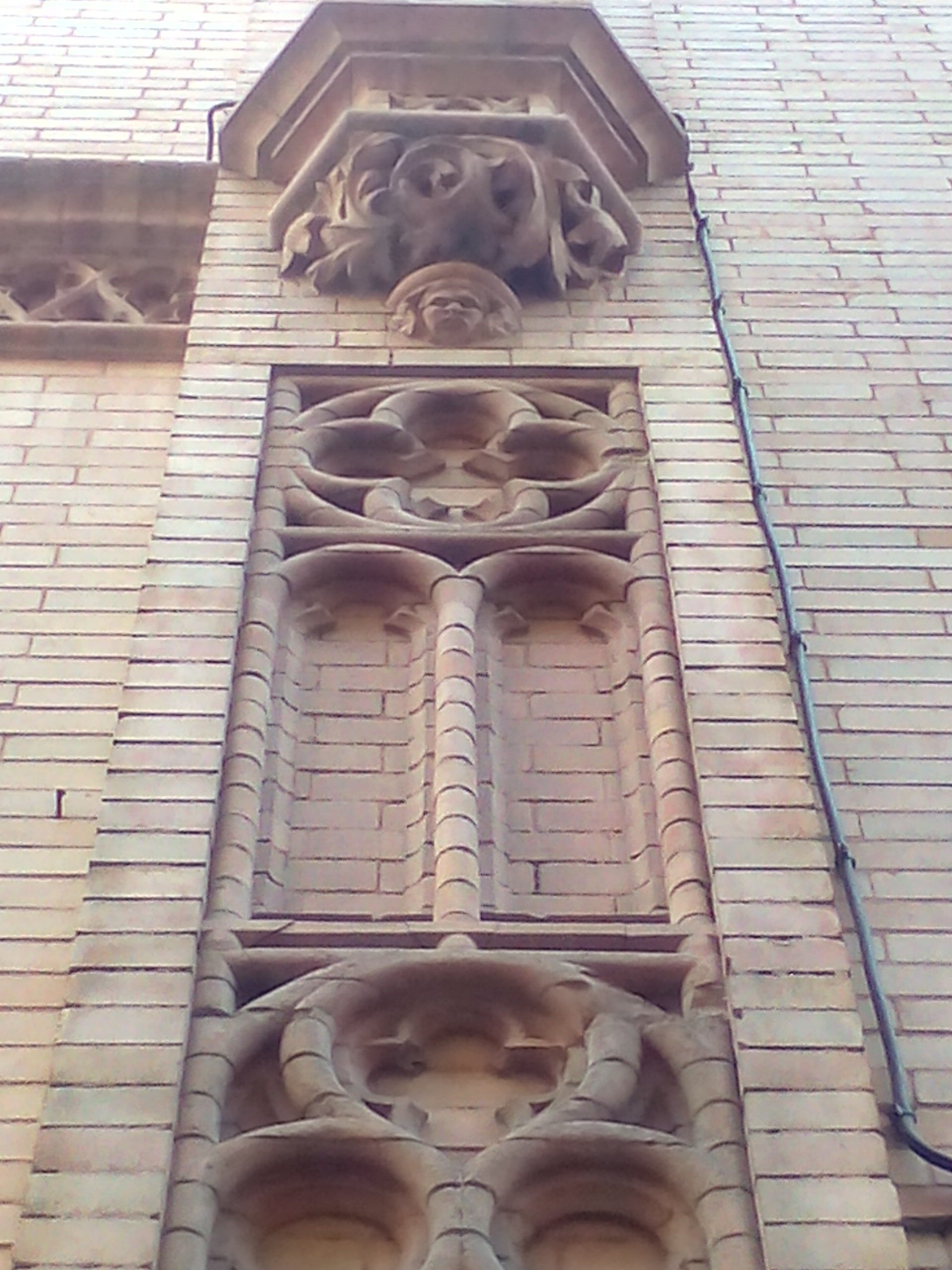 A lo largo de toda la fachada el ladrillo aparece maravillosamente labrado en las alargadas cenefas compuestas por diminutas figuras de simbología cristiana entre temas vegetales.