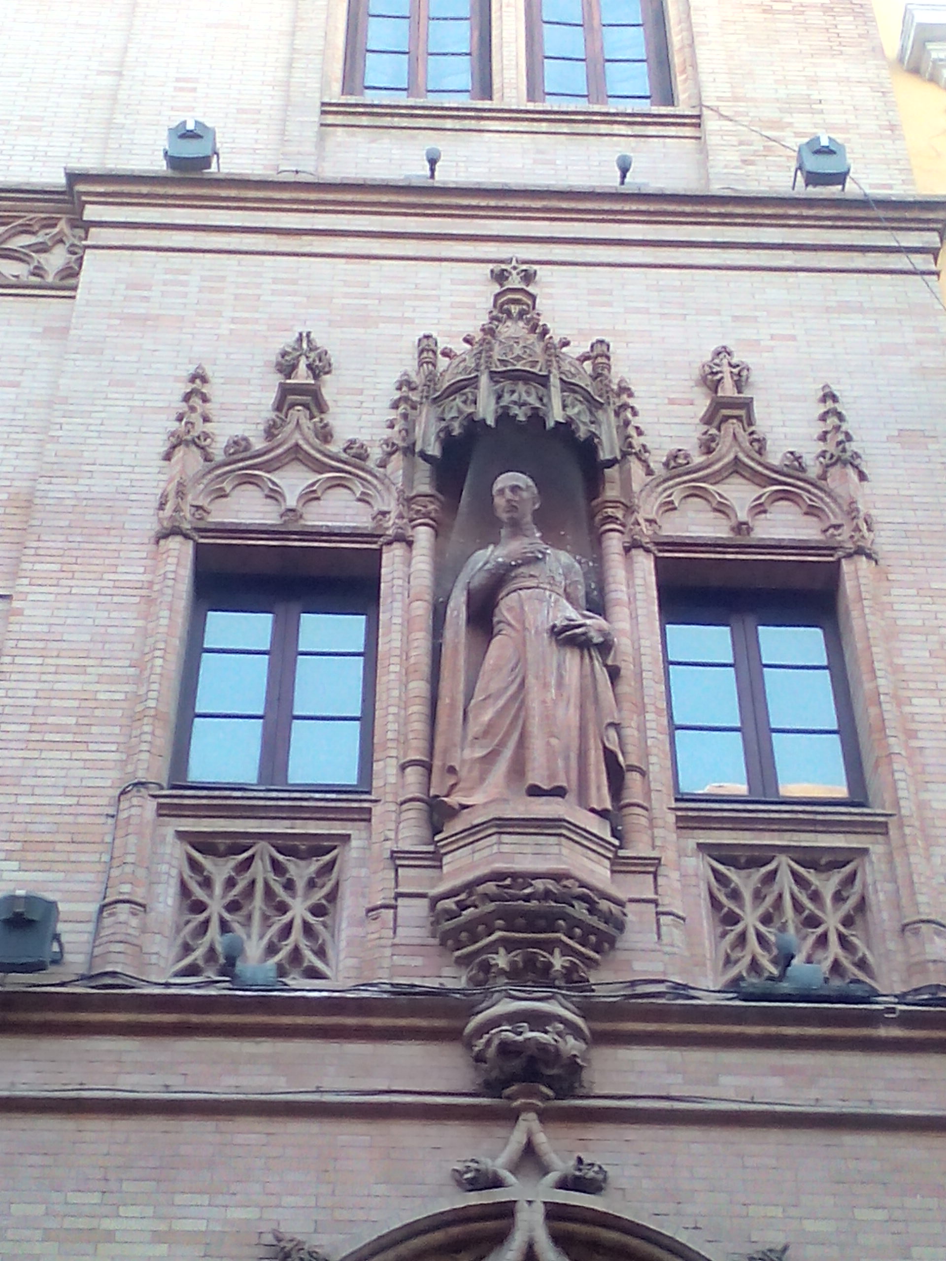 También utiliza el ladrillo tallado en la preciosa portada de la fachada coronada por arcos polilobulados, en la cual sobre ella se encuentra la bella imagen de San Ignacio de Loyola, realizada por el escultor José Lafita Díaz (1887-1945).