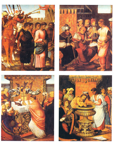 San Ambrosio en un texto la describe como una anciana de gran vitalidad, que se pregunta: «He aquí el lugar de la batalla: ¿pero dónde está el trofeo de la victoria? ¿Yo estoy en un trono y la cruz del Señor enterrada en el polvo? ¿Yo estoy rodeada de oro y el triunfo de Cristo entre las ruinas? (…). Veo que has hecho todo lo posible, diablo, para que fuese sepultada la espada que te ha reducido a la nada.»